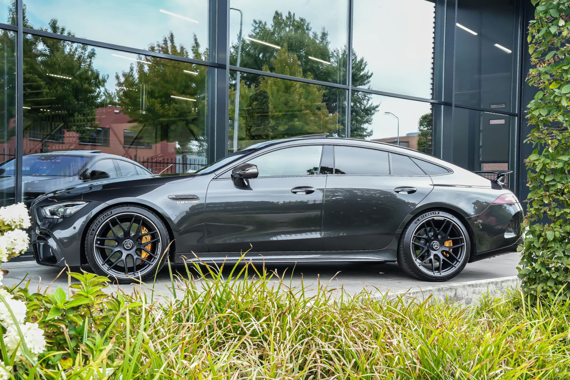 Buiten laat hij direct zien dat het menens is: AMG carbon exterieurpakket, carbon buitenspiegels, statische carbon achterspoiler, hoogglans Shadow Line, 21 inch AMG dubbelspaaks velgen en donker getint glas.